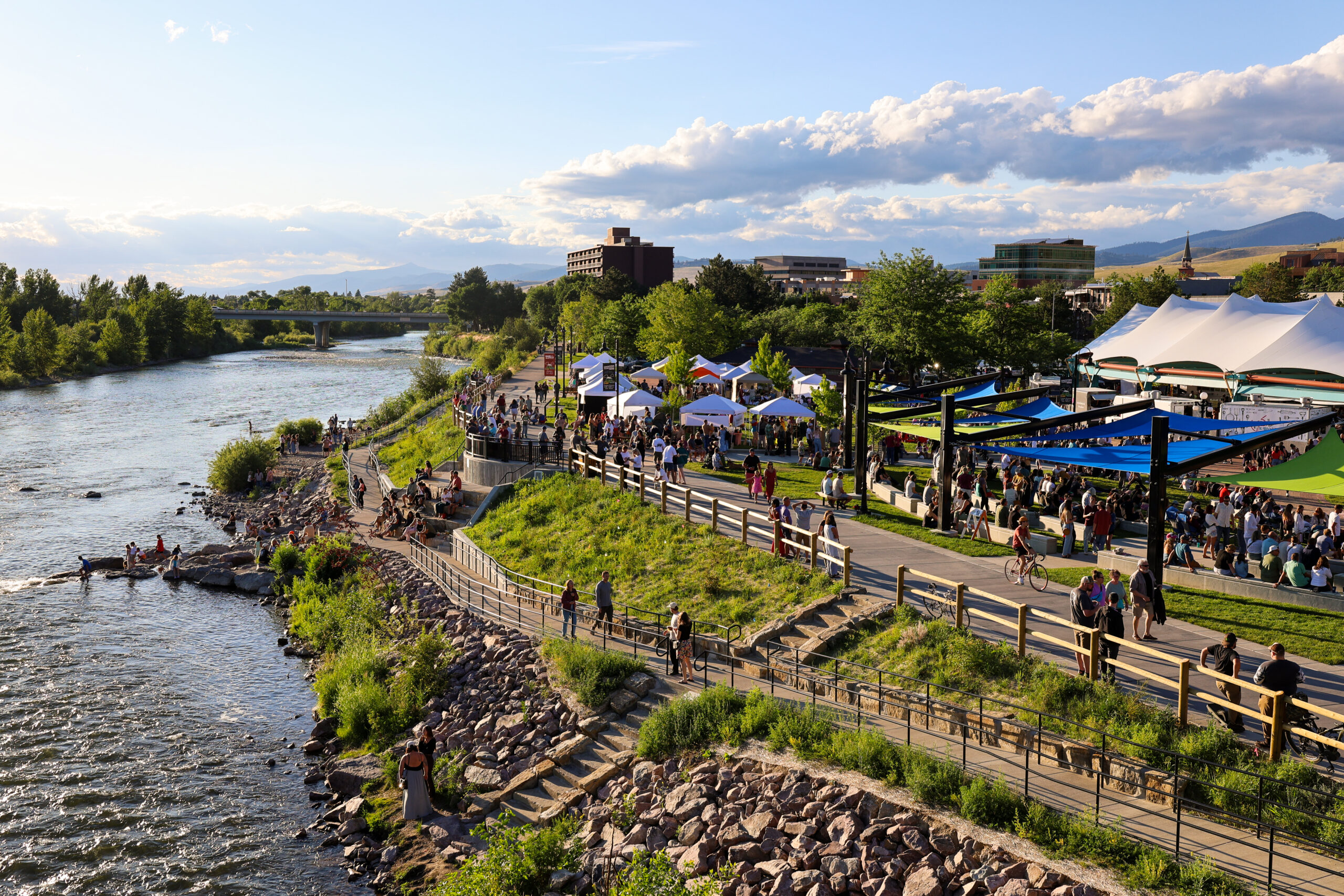 In 1997, the current Caras Park pavilion was installed, establishing the park as Missoula’s true city center and town square ever since. Caras Park has seen multiple upgrades in the past five years, including the Caras Terrace Project, upgraded seating and shading, a stormwater infiltration system, restroom upgrades, the Beartracks Underbridge Playground, and improved accessibility features.