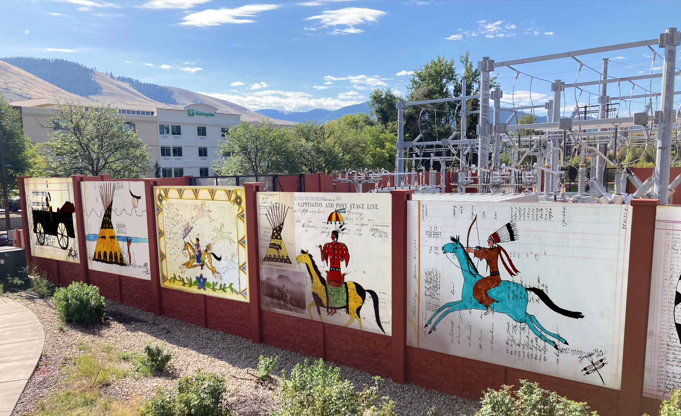 The Downtown Riverside Art Walls Project (DRAW) aims to beautify the NorthWestern Energy electrical substation in Downtown Missoula by enveloping it with artwork by living Native American artists from the cultures that first lived in this valley. It especially showcases Salish and Blackfoot drawings, paintings, and poetry.